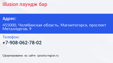 illusion, лаундж-бар по адресу 455000, Челябинская область, Магнитогорск, проспект Металлургов, 9 в дальнейшем Организация, размещена в следующих категориях: