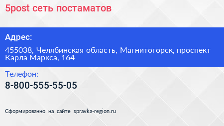 5post, сеть постаматов по адресу 455038, Челябинская область, Магнитогорск, проспект Карла Маркса, 164 в дальнейшем Организация, размещена в следующих категориях: