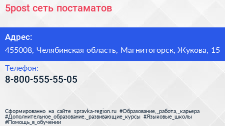 5post, сеть постаматов по адресу 455008, Челябинская область, Магнитогорск, Жукова, 15 в дальнейшем Организация, размещена в следующих категориях: