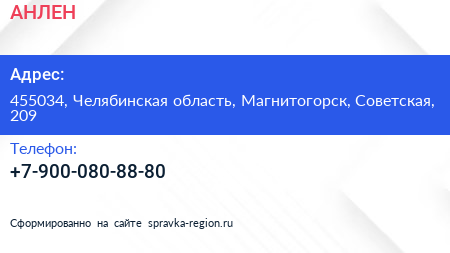 АНЛЕН по адресу 455034, Челябинская область, Магнитогорск, Советская, 209 в дальнейшем Организация, размещена в следующих категориях: