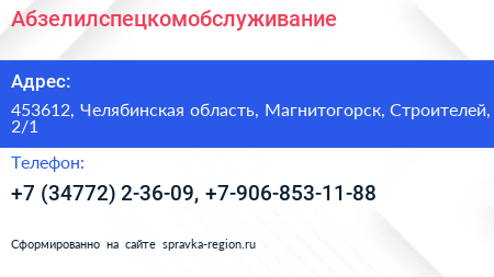 Абзелилспецкомобслуживание по адресу 453612, Челябинская область, Магнитогорск, Строителей, 2/1 в дальнейшем Организация, размещена в следующих категориях: