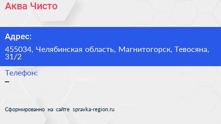 Аква Чисто по адресу 455034, Челябинская область, Магнитогорск, Тевосяна, 31/2 в дальнейшем Организация, размещена в следующих категориях: