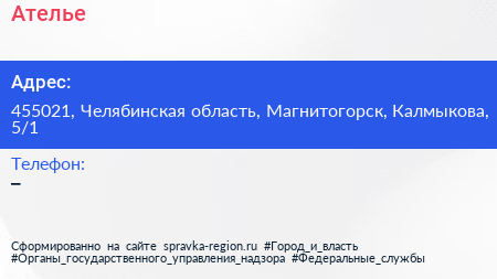 Ателье по адресу 455021, Челябинская область, Магнитогорск, Калмыкова, 5/1 в дальнейшем Организация, размещена в следующих категориях: