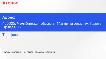 Ателье по адресу 455025, Челябинская область, Магнитогорск, им. Газеты Правда, 72 в дальнейшем Организация, размещена в следующих категориях: