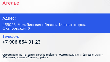 Ателье по адресу 455023, Челябинская область, Магнитогорск, Октябрьская, 9 в дальнейшем Организация, размещена в следующих категориях: