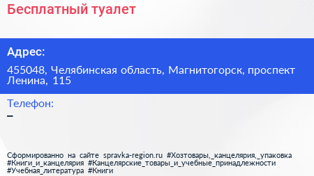 Бесплатный туалет по адресу 455048, Челябинская область, Магнитогорск, проспект Ленина, 115 в дальнейшем Организация, размещена в следующих категориях: