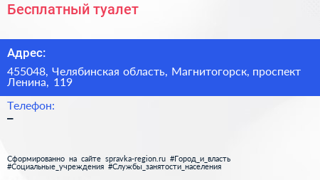 Бесплатный туалет по адресу 455048, Челябинская область, Магнитогорск, проспект Ленина, 119 в дальнейшем Организация, размещена в следующих категориях: