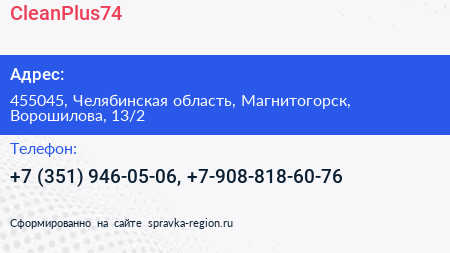 CleanPlus74 по адресу 455045, Челябинская область, Магнитогорск, Ворошилова, 13/2 в дальнейшем Организация, размещена в следующих категориях: