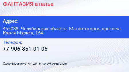 ФАНТАЗИЯ, ателье по адресу 455038, Челябинская область, Магнитогорск, проспект Карла Маркса, 164 в дальнейшем Организация, размещена в следующих категориях: