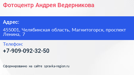 Фотоцентр Андрея Ведерникова по адресу 455001, Челябинская область, Магнитогорск, проспект Ленина, 7 в дальнейшем Организация, размещена в следующих категориях: