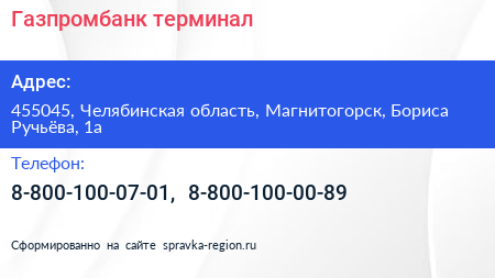 Газпромбанк, терминал по адресу 455045, Челябинская область, Магнитогорск, Бориса Ручьёва, 1а в дальнейшем Организация, размещена в следующих категориях: