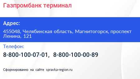 Газпромбанк, терминал по адресу 455048, Челябинская область, Магнитогорск, проспект Ленина, 121 в дальнейшем Организация, размещена в следующих категориях: