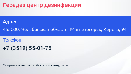 Герадез, центр дезинфекции по адресу 455000, Челябинская область, Магнитогорск, Кирова, 94 в дальнейшем Организация, размещена в следующих категориях: