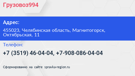 Грузовоз994 по адресу 455023, Челябинская область, Магнитогорск, Октябрьская, 11 в дальнейшем Организация, размещена в следующих категориях: