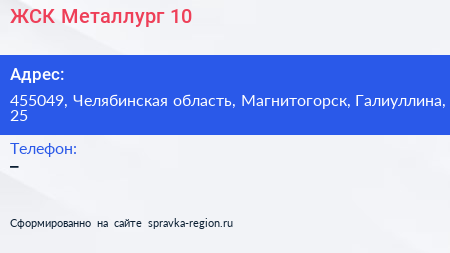 ЖСК Металлург-10 по адресу 455049, Челябинская область, Магнитогорск, Галиуллина, 25 в дальнейшем Организация, размещена в следующих категориях: