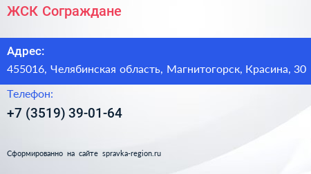 ЖСК Сограждане по адресу 455016, Челябинская область, Магнитогорск, Красина, 30 в дальнейшем Организация, размещена в следующих категориях: