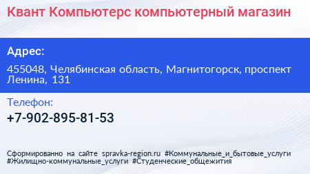 Квант-Компьютерс, компьютерный магазин по адресу 455048, Челябинская область, Магнитогорск, проспект Ленина, 131 в дальнейшем Организация, размещена в следующих категориях: