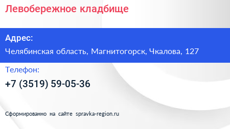Левобережное кладбище по адресу Челябинская область, Магнитогорск, Чкалова, 127 в дальнейшем Организация, размещена в следующих категориях: