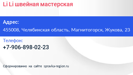 Li-Li, швейная мастерская по адресу 455008, Челябинская область, Магнитогорск, Жукова, 23 в дальнейшем Организация, размещена в следующих категориях: