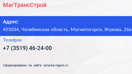 МагТрансСтрой по адресу 455034, Челябинская область, Магнитогорск, Жукова, 26а в дальнейшем Организация, размещена в следующих категориях: