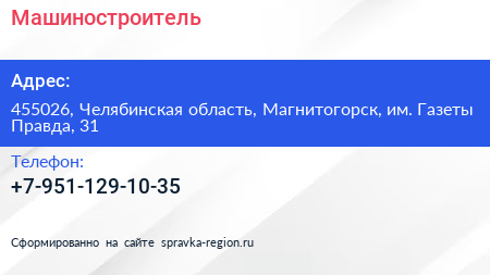 Машиностроитель по адресу 455026, Челябинская область, Магнитогорск, им. Газеты Правда, 31 в дальнейшем Организация, размещена в следующих категориях: