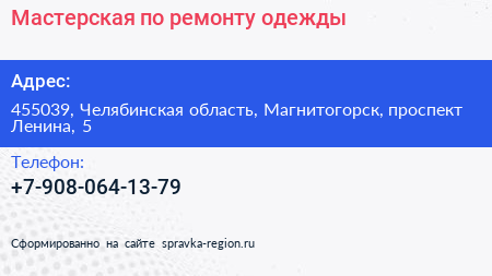 Мастерская по ремонту одежды по адресу 455039, Челябинская область, Магнитогорск, проспект Ленина, 5 в дальнейшем Организация, размещена в следующих категориях: