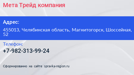 Мета-Трейд, компания по адресу 455013, Челябинская область, Магнитогорск, Шоссейная, 52 в дальнейшем Организация, размещена в следующих категориях: