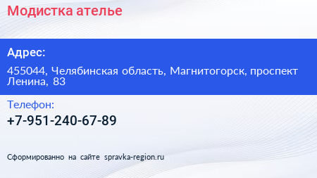 Модистка, ателье по адресу 455044, Челябинская область, Магнитогорск, проспект Ленина, 83 в дальнейшем Организация, размещена в следующих категориях: