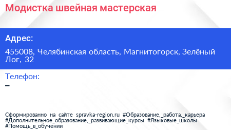 Модистка, швейная мастерская по адресу 455008, Челябинская область, Магнитогорск, Зелёный Лог, 32 в дальнейшем Организация, размещена в следующих категориях: