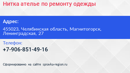 Нитка, ателье по ремонту одежды по адресу 455023, Челябинская область, Магнитогорск, Ленинградская, 27 в дальнейшем Организация, размещена в следующих категориях: