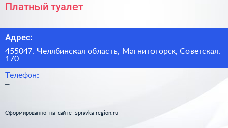 Платный туалет по адресу 455047, Челябинская область, Магнитогорск, Советская, 170 в дальнейшем Организация, размещена в следующих категориях: