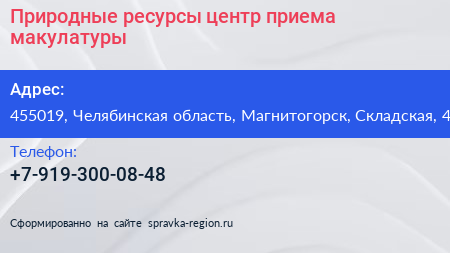 Природные ресурсы, центр приема макулатуры по адресу 455019, Челябинская область, Магнитогорск, Складская, 4 в дальнейшем Организация, размещена в следующих категориях: