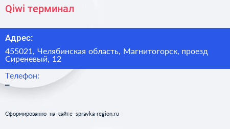 Qiwi, терминал по адресу 455021, Челябинская область, Магнитогорск, проезд Сиреневый, 12 в дальнейшем Организация, размещена в следующих категориях: