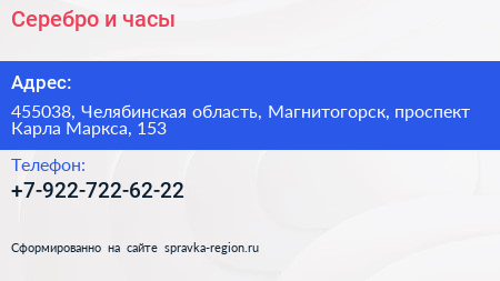 Серебро и часы по адресу 455038, Челябинская область, Магнитогорск, проспект Карла Маркса, 153 в дальнейшем Организация, размещена в следующих категориях: