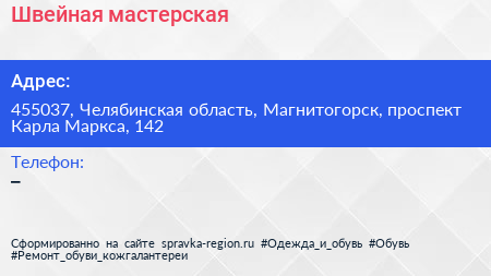 Швейная мастерская по адресу 455037, Челябинская область, Магнитогорск, проспект Карла Маркса, 142 в дальнейшем Организация, размещена в следующих категориях: