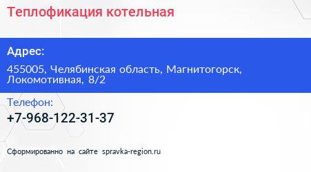 Теплофикация, котельная по адресу 455005, Челябинская область, Магнитогорск, Локомотивная, 8/2 в дальнейшем Организация, размещена в следующих категориях: