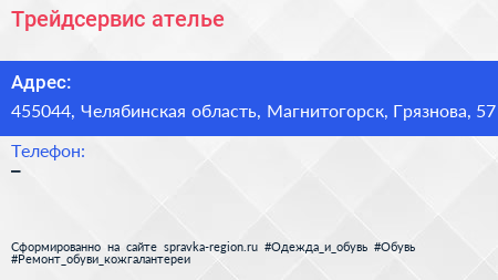 Трейдсервис, ателье по адресу 455044, Челябинская область, Магнитогорск, Грязнова, 57 в дальнейшем Организация, размещена в следующих категориях: