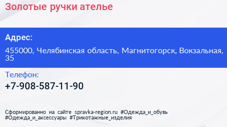 Золотые ручки, ателье по адресу 455000, Челябинская область, Магнитогорск, Вокзальная, 35 в дальнейшем Организация, размещена в следующих категориях:
