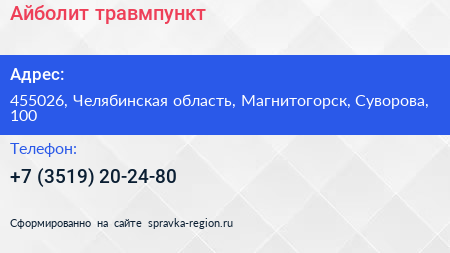 Айболит, травмпункт по адресу 455026, Челябинская область, Магнитогорск, Суворова, 100 в дальнейшем Организация, размещена в следующих категориях:
