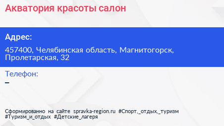 Акватория красоты, салон по адресу 457400, Челябинская область, Магнитогорск, Пролетарская, 32 в дальнейшем Организация, размещена в следующих категориях: