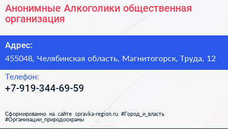 Анонимные Алкоголики, общественная организация по адресу 455048, Челябинская область, Магнитогорск, Труда, 12 в дальнейшем Организация, размещена в следующих категориях: