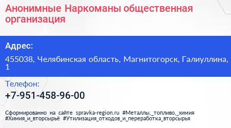 Анонимные Наркоманы, общественная организация по адресу 455038, Челябинская область, Магнитогорск, Галиуллина, 1 в дальнейшем Организация, размещена в следующих категориях:
