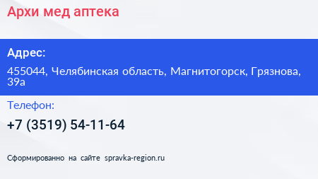 Архи-мед, аптека по адресу 455044, Челябинская область, Магнитогорск, Грязнова, 39а в дальнейшем Организация, размещена в следующих категориях: