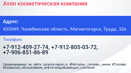 Avon, косметическая компания по адресу 455049, Челябинская область, Магнитогорск, Труда, 32а в дальнейшем Организация, размещена в следующих категориях: