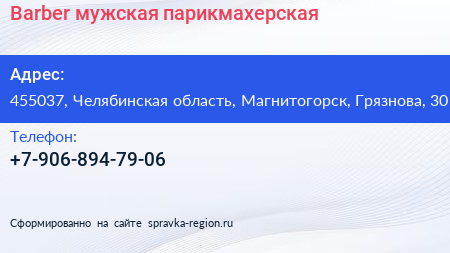 Barber, мужская парикмахерская по адресу 455037, Челябинская область, Магнитогорск, Грязнова, 30 в дальнейшем Организация, размещена в следующих категориях: