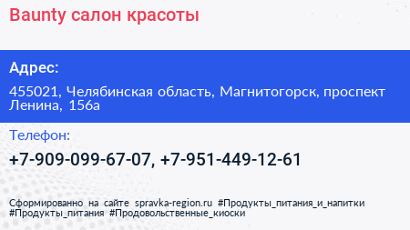 Baunty, салон красоты по адресу 455021, Челябинская область, Магнитогорск, проспект Ленина, 156а в дальнейшем Организация, размещена в следующих категориях: