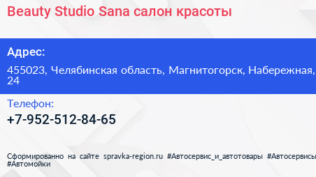Beauty Studio Sana, салон красоты по адресу 455023, Челябинская область, Магнитогорск, Набережная, 24 в дальнейшем Организация, размещена в следующих категориях: