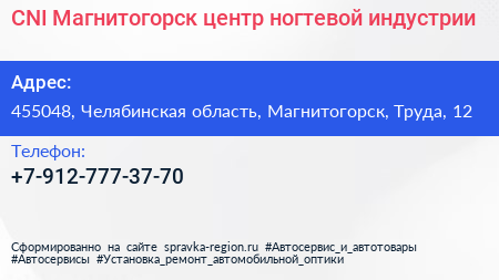 CNI-Магнитогорск, центр ногтевой индустрии по адресу 455048, Челябинская область, Магнитогорск, Труда, 12 в дальнейшем Организация, размещена в следующих категориях: