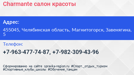 Charmante, салон красоты по адресу 455045, Челябинская область, Магнитогорск, Завенягина, 5 в дальнейшем Организация, размещена в следующих категориях: