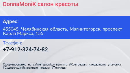DonnaMoniK, салон красоты по адресу 455045, Челябинская область, Магнитогорск, проспект Карла Маркса, 155 в дальнейшем Организация, размещена в следующих категориях: